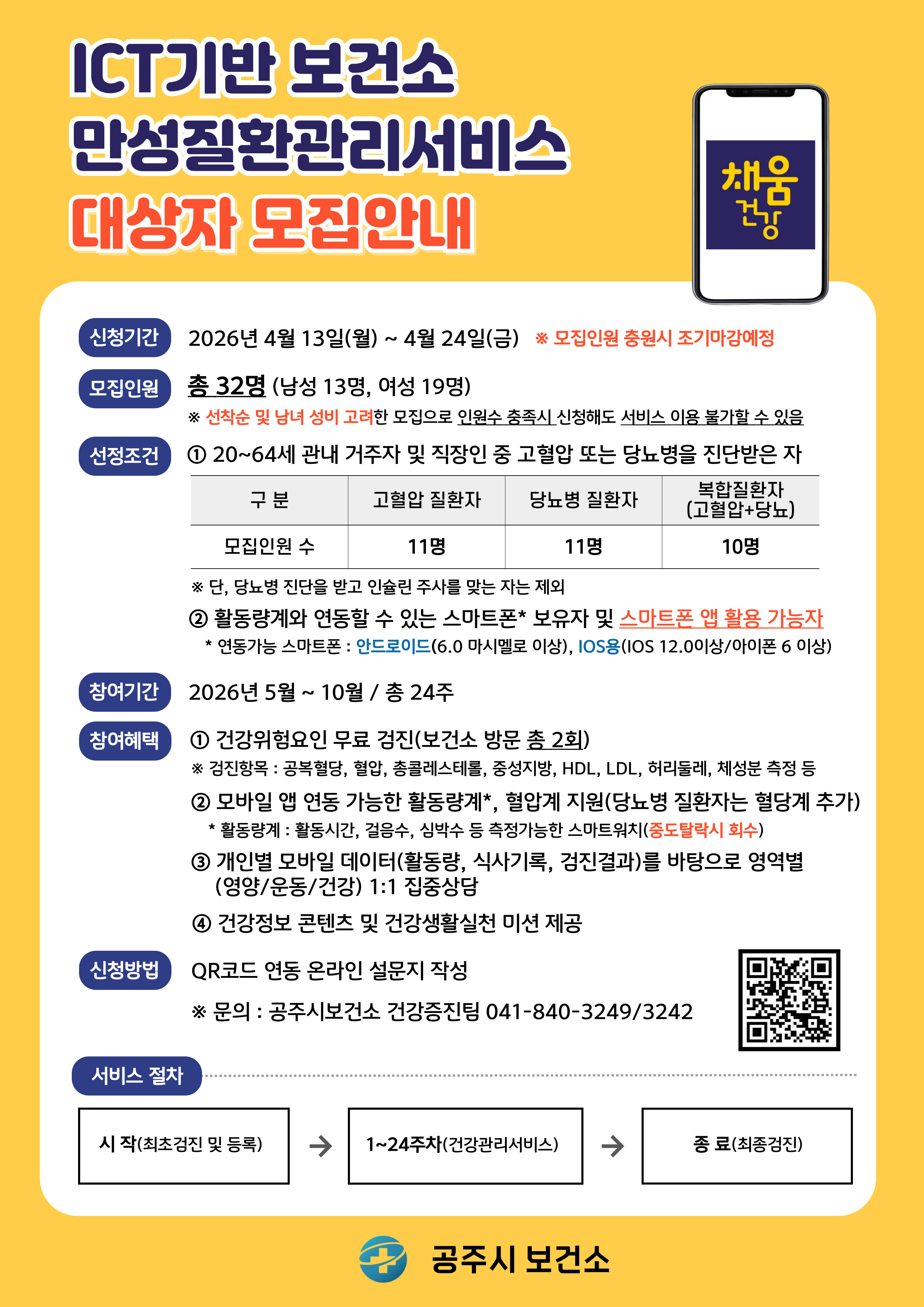 | 2023 | ICT기반 보건소 만성질환관리 서비스 대상자 모집 홍보 새글 | 웅진동 | 2 | 2026-04-16 | 홍보 포스터.jpg |
