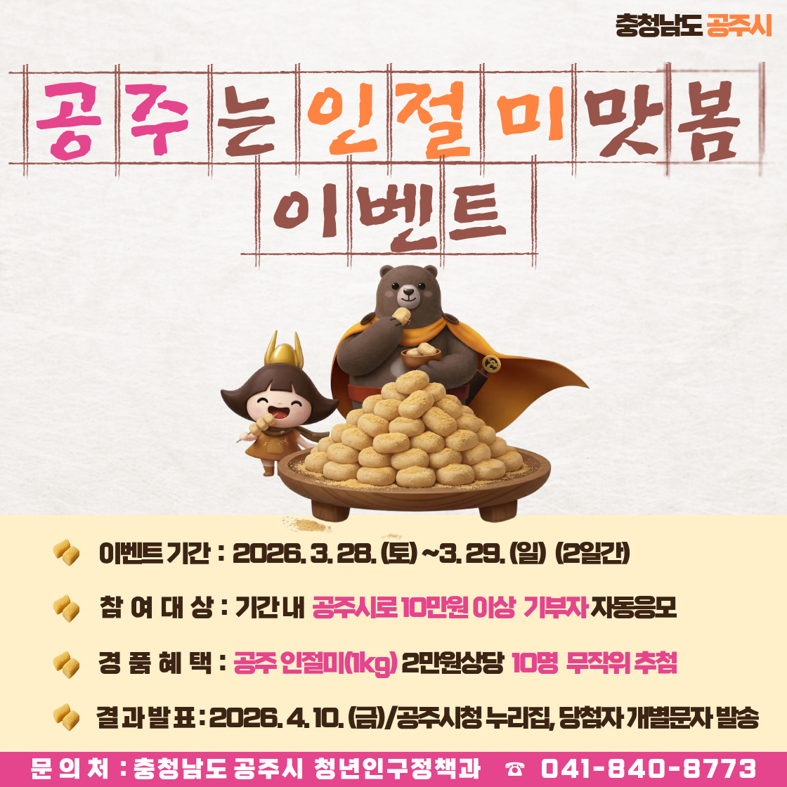 | 70 | [내마음 공주愛] 고향사랑기부제 '공주는 인절미 맛봄' 이벤트 안내 새글 | 청년인구정책과 | 7 | 2026-03-26 | 1120 1120 2.png |